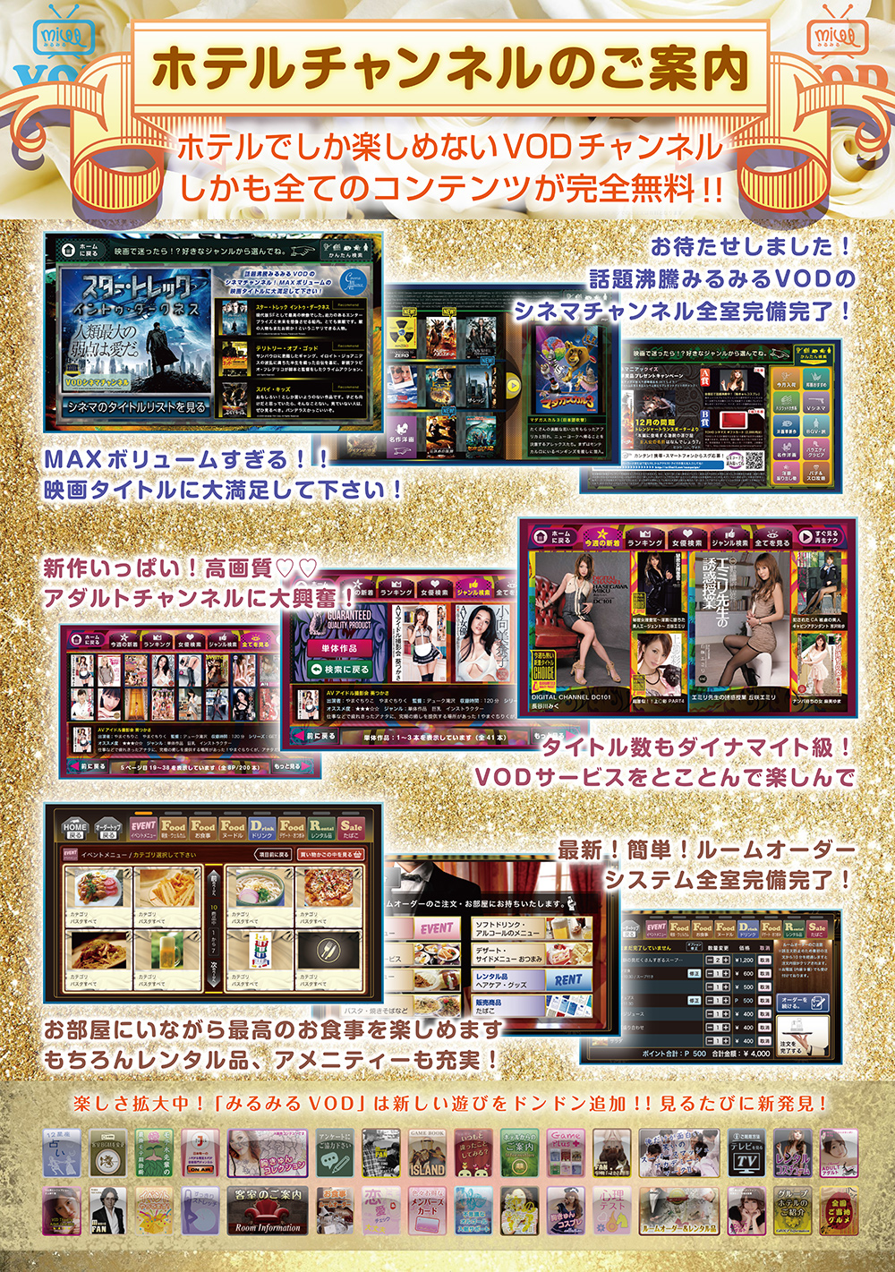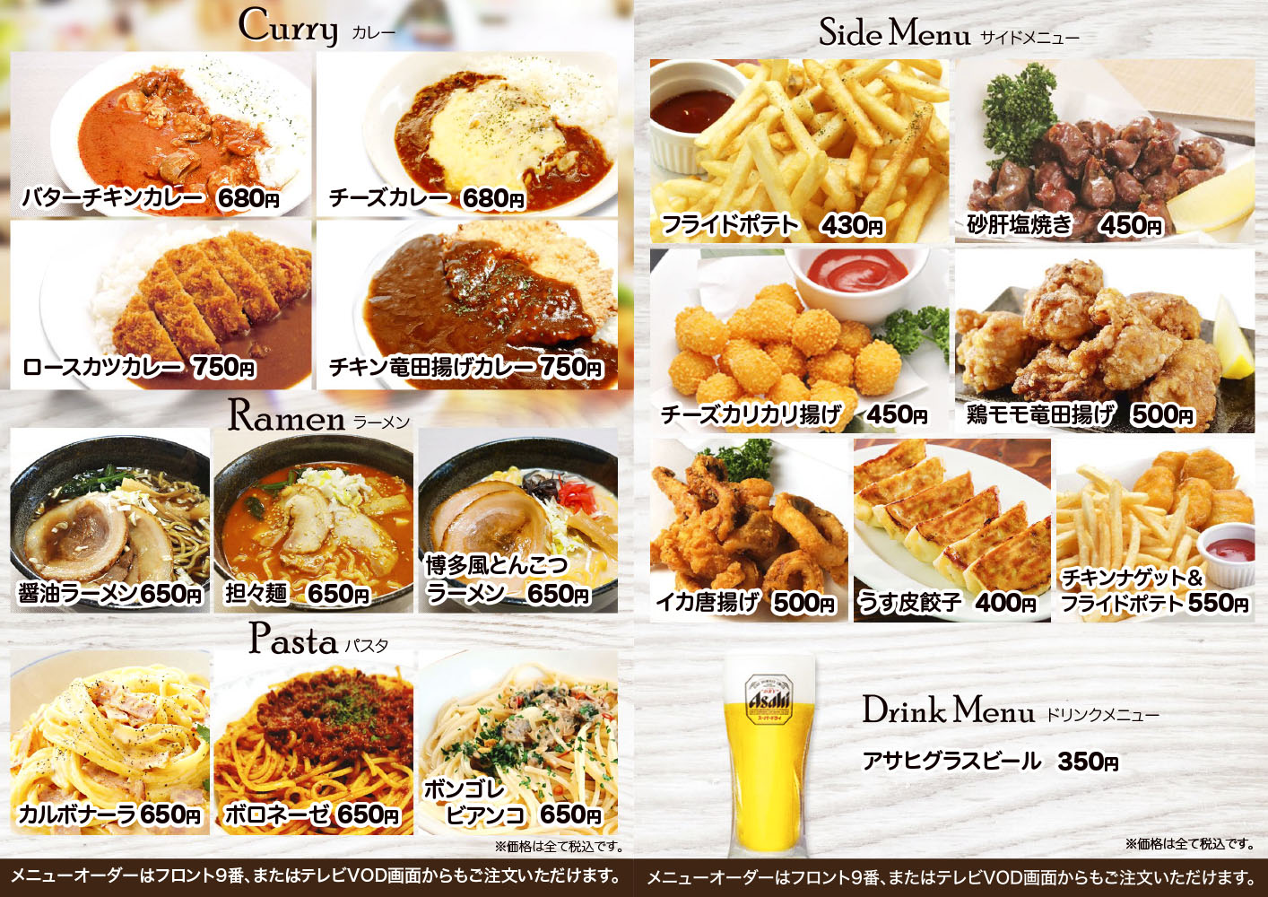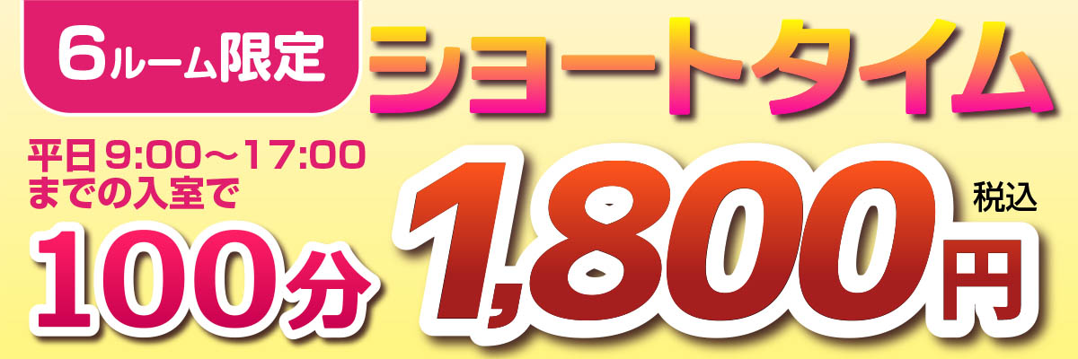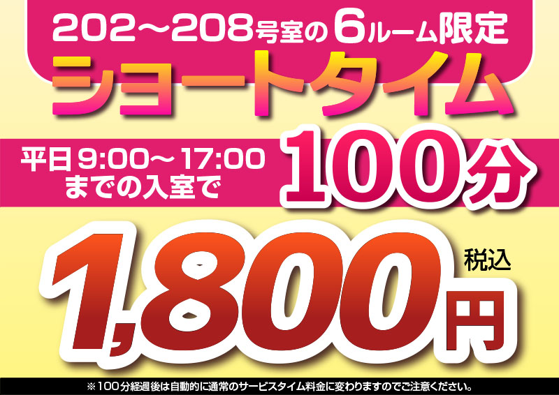 | ショートタイム | 【平日のみ】 9時~17時までの入室で、100分間で ¥1,800 ※100分経過後はショートタイムではなくサービスタイムの料金¥3,500となります。 ※表示金額は税込です。 ※ショートタイムはDランクの202号室、203号室、206号室、207号室、208号室のみの設定となります。 |